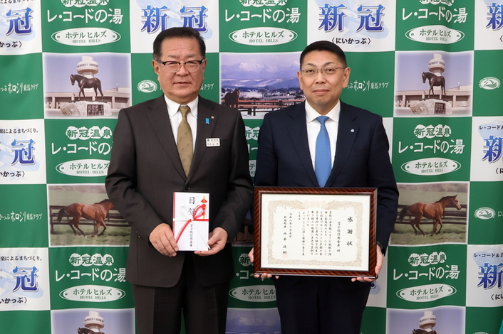 当町に本場を構える有限会社ビッグレッドファーム様の関連会社である、株式会社 サラブレッドクラブ ラフィアン様(代表取締役 岡田 紘和 様)より300万円のご寄附を頂きました。