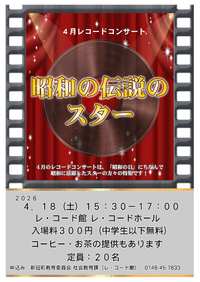 4月のレコードコンサートは4月29日の「昭和の日」にちなんで『昭和の伝説のスター』特集です。