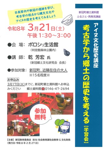 新冠町や日高管内の遺跡を通して、考古学の視点から縄文文化やアイヌ文化の歴史を考えます。わかりやすく写真や図表を用いて説明します。また、新冠町内の考古資料もミニ展示します。ぜひお気軽に参加ください。