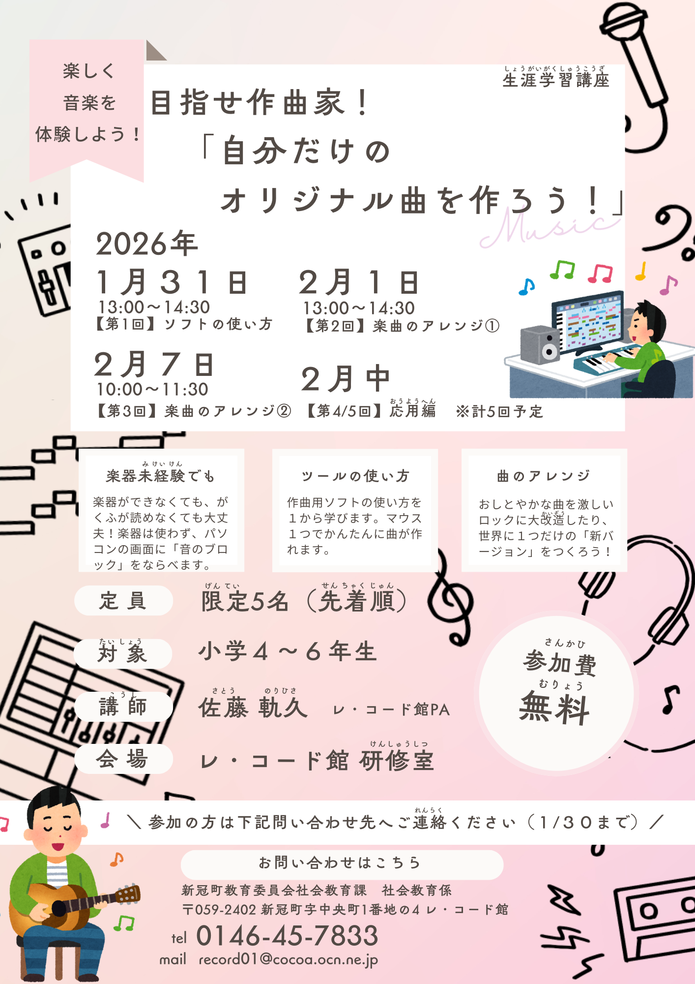 小学4~6年生を対象に、作曲体験講座を開催します。